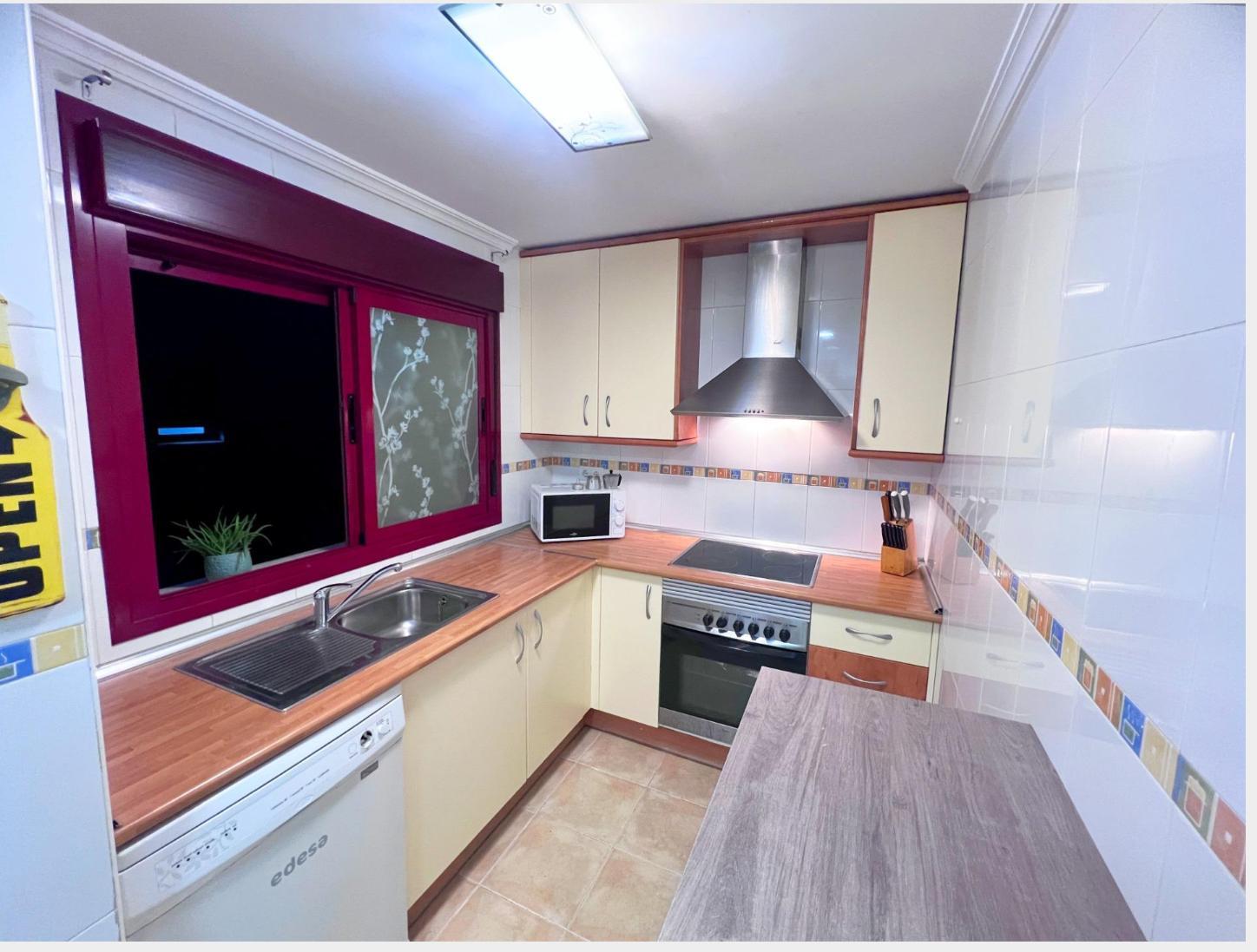 Piso de 84m construidos, con 2 dormitorios con armarios empotrados, salón independiente con salida a terraza de 8m con vistas a la piscina, cocina amueblada con horno, campana y vitroceramica, tendedero cubierto con mueble lavadero, 2 baños completos.